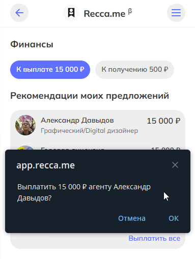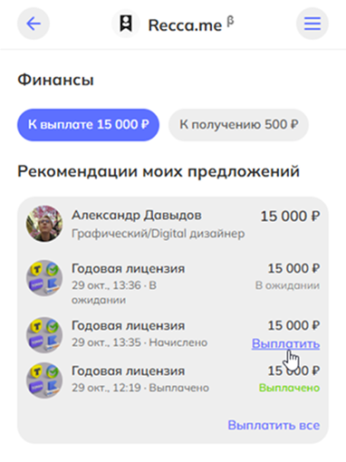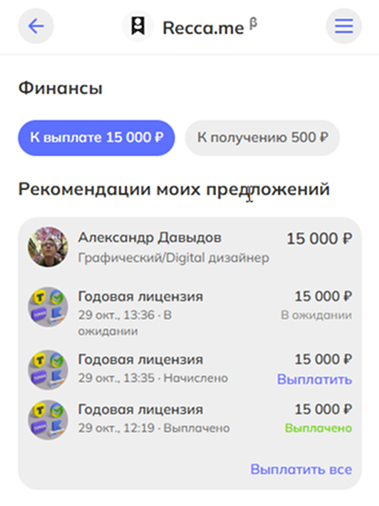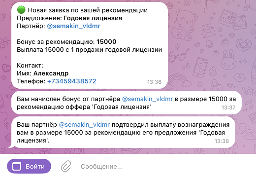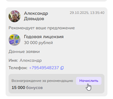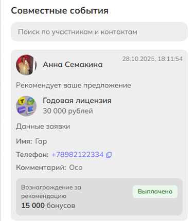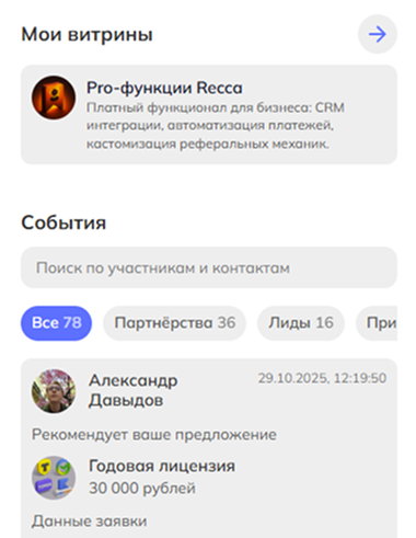 🔍 Пример: вы видите событие «Александр Давыдов рекомендовал ваше предложение». Это значит, что партнёр поделился вашим оффером и у вас появился новый потенциальный клиент.