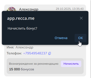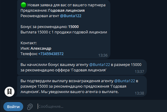 💡 Совет: подтверждайте начисление бонуса агентам, чтобы сеть больше доверяла вам.