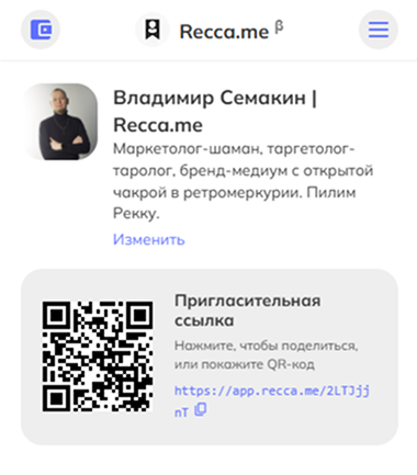 На главной странице вы видите свой профиль, QR-код и ссылку-приглашение, список витрин (на платном тарифе), и ленту событий — ваша история рекомендаций, сделок и начисления.