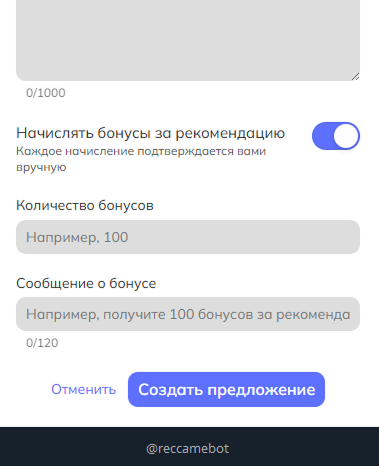Оффер содержит: название, категорию, статус, цену, описание и бонус для агента. Можно включить или отключить начисления за рекомендации.