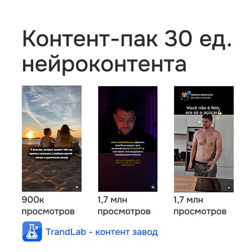 Тренд-анализ + нейросценарии +адаптация+ монтаж. 30 материалов под вашу нишу и аудиторию за 15 дней.